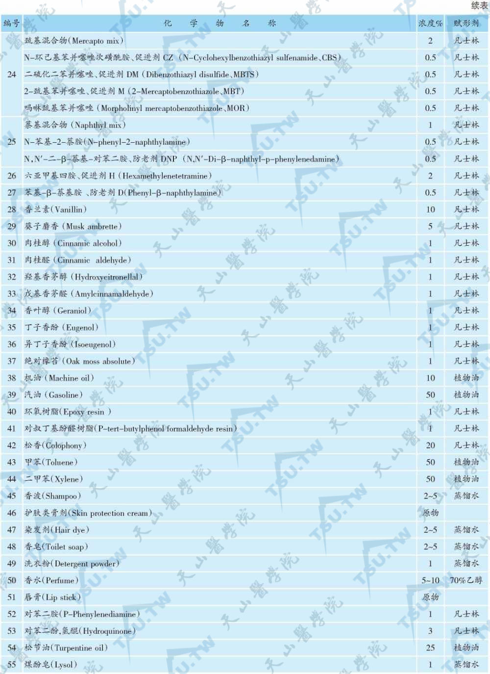 皮肤斑贴试验常用变应原浓度及赋形剂